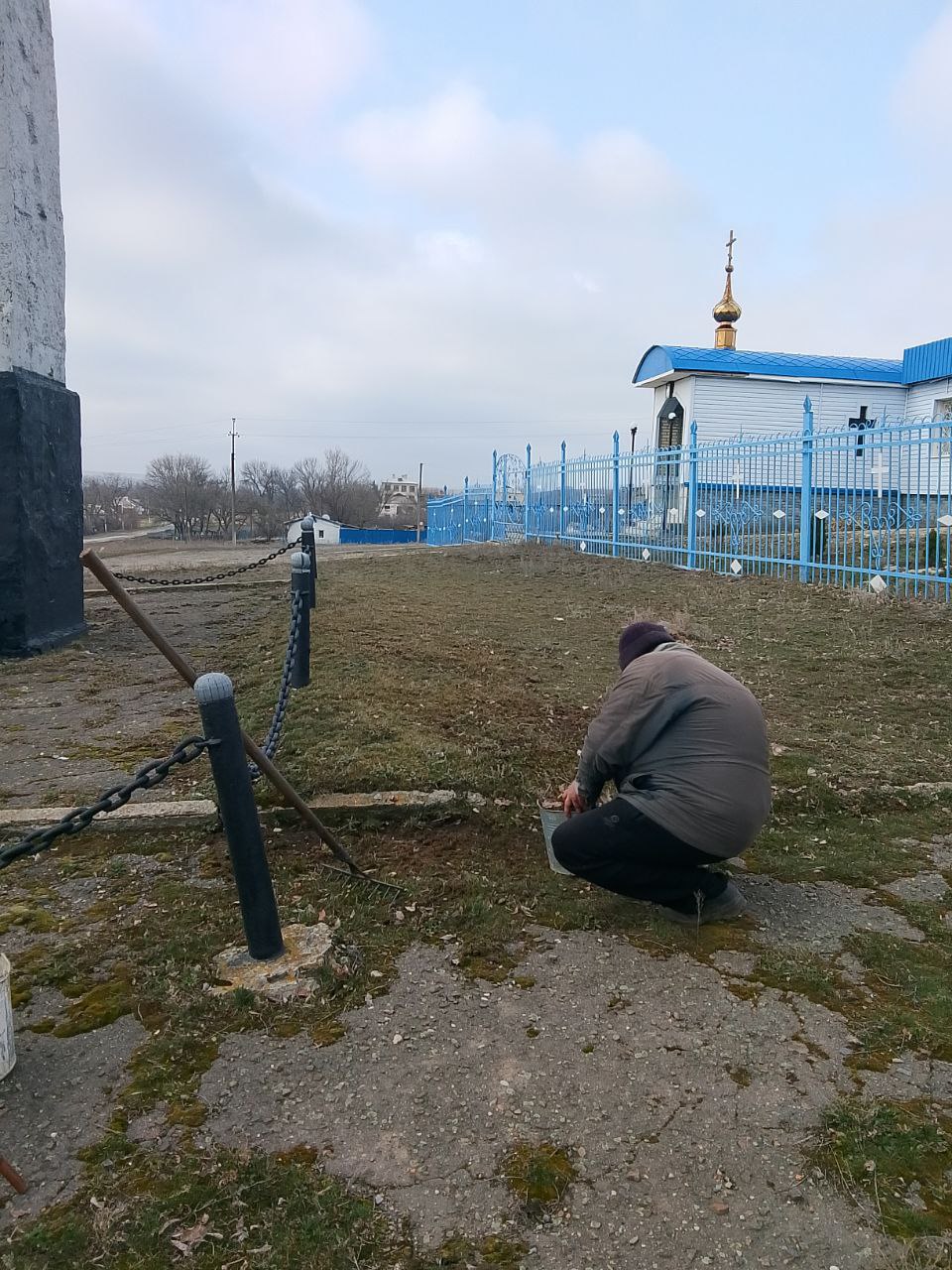 Был убран сорняк между плитами, сухие листья, сухостой. Очистили территорию, прилегающую к памятнику. В дальнейшем, к майским праздникам, планируется проведение косметического ремонта памятника.