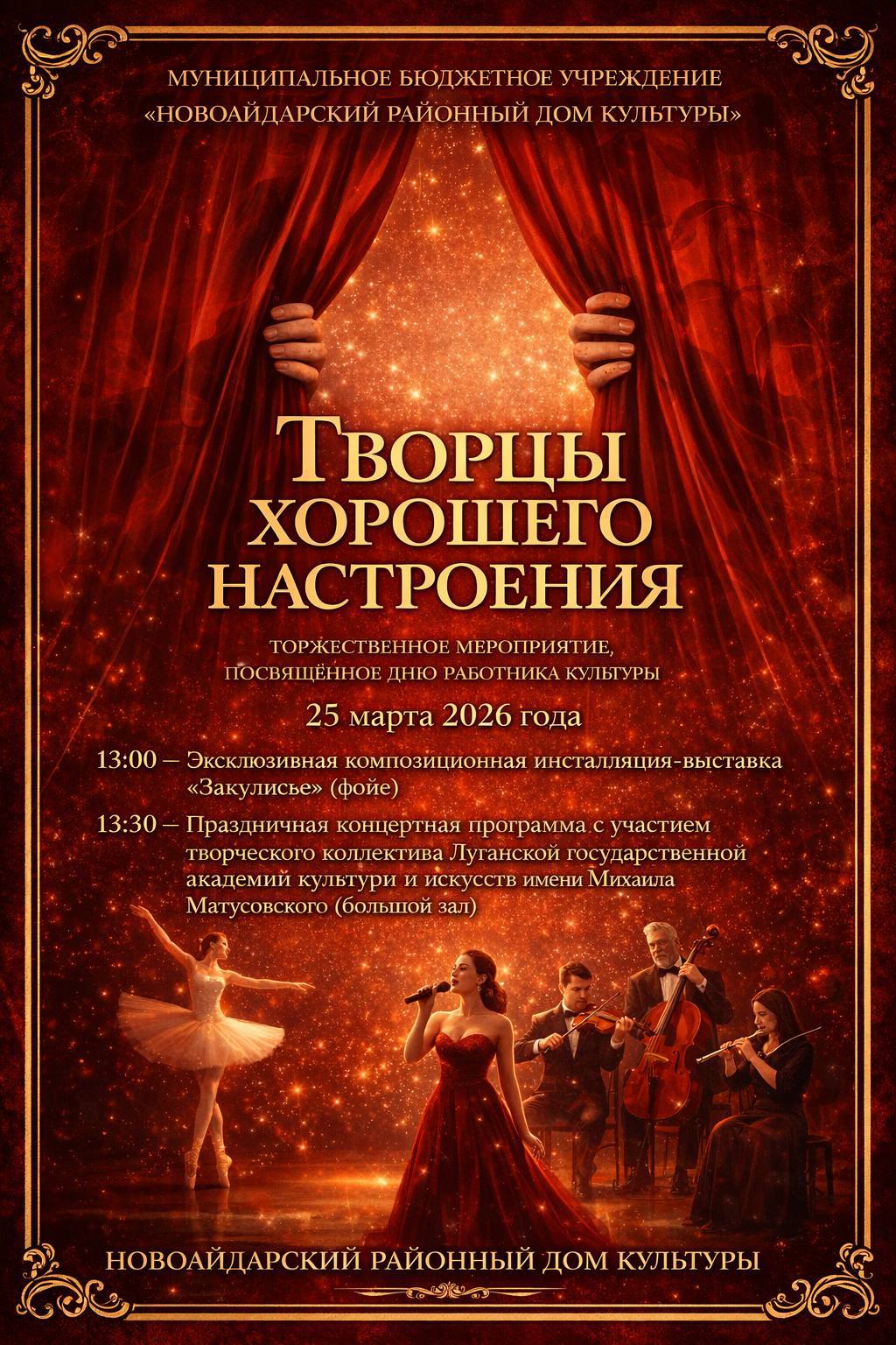 25 марта в Новоайдарском районном Доме культуры состоится торжественное мероприятие, посвящённое Дню работника культуры — важному и значимому празднику для всех, кто хранит, развивает и передаёт духовные ценности нашего народа.