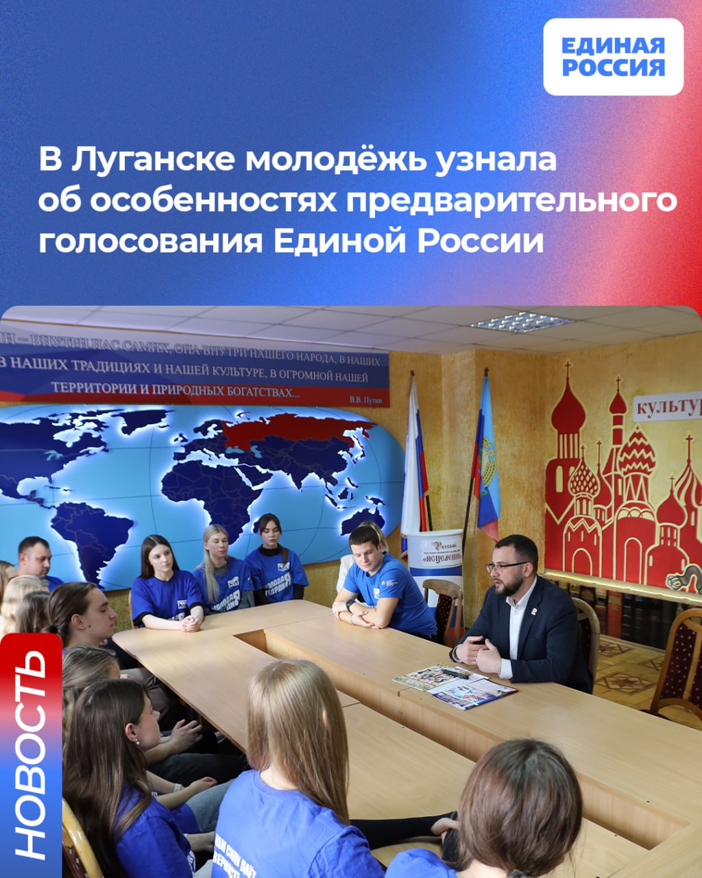 В Луганске на базе Луганского государственного медицинского университета имени Святителя Луки состоялась дискуссионная площадка с участием активистов «Молодой Гвардии Единой России», посвящённая теме: «Для чего проводится предварительное голосование «Единой России»?».