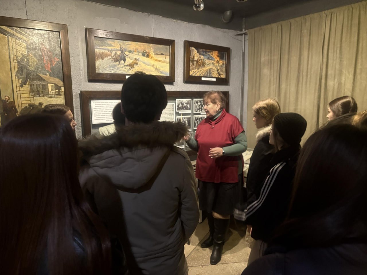 Научный сотрудник Татьяна Данилова рассказала ребятам о трагических последних днях и часах жизни пятерых героев-подпольщиков: Олега Кошевого, Любови Шевцовой, Виктора Субботина, Дмитрия Огурцова и Семёна Остапенко, которые приняли мученическую смерть в застенках Ровеньковского гестапо.