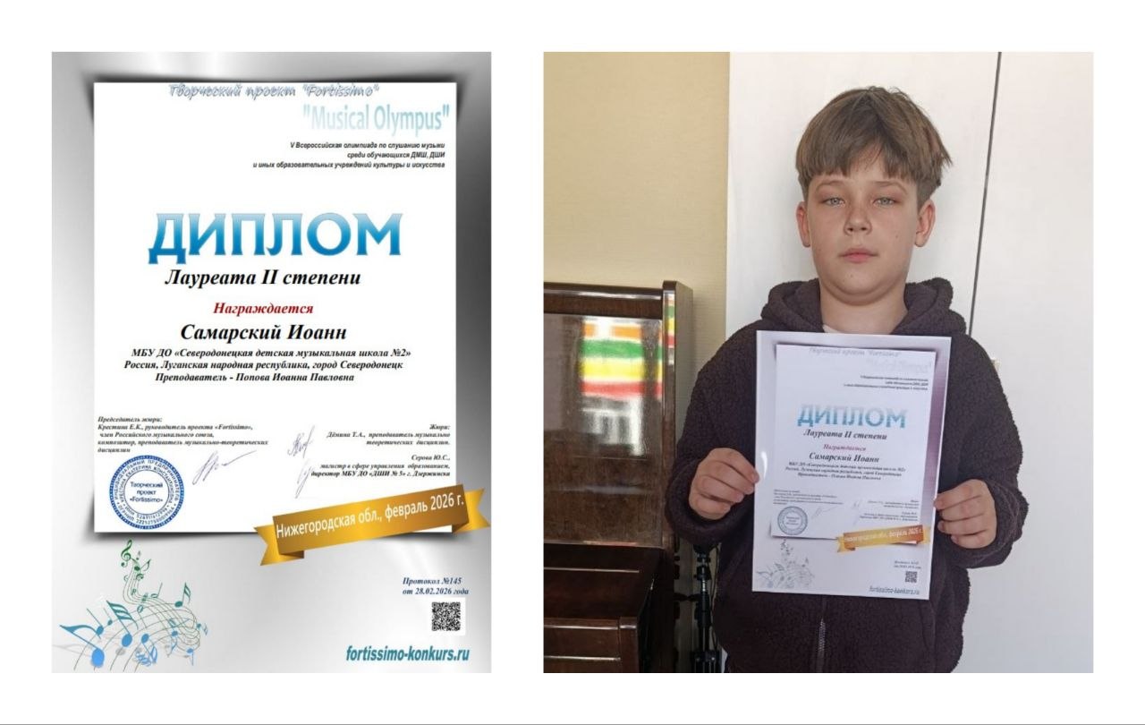 Сразу двое юных музыкантов нашей школы стали лауреатами II степени V Всероссийской олимпиады по слушанию музыки среди обучающихся ДМШ, ДШИ и иных образовательных учреждений культуры и искусства.