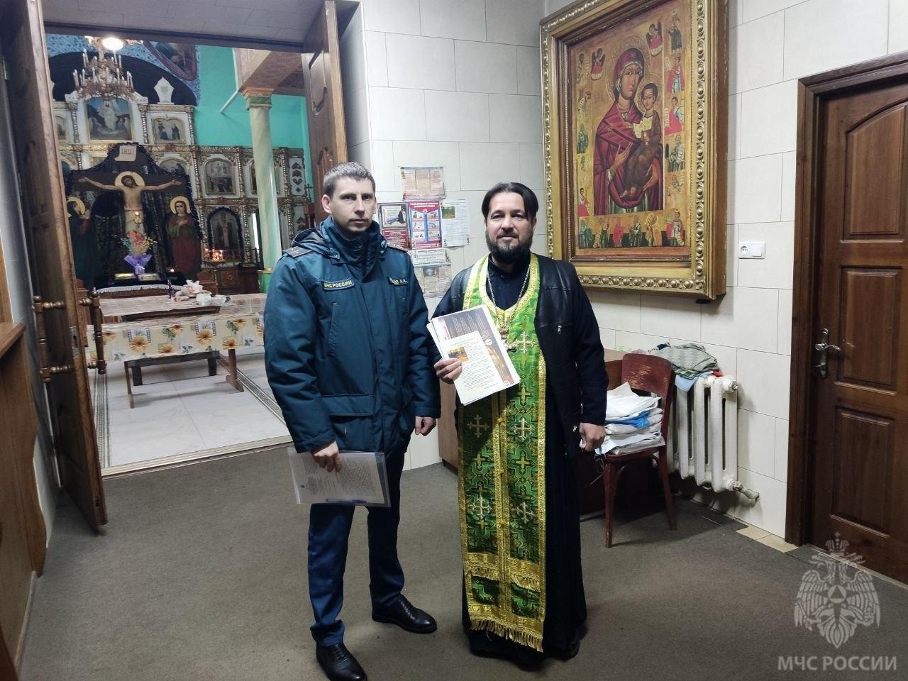 Сотрудниками чрезвычайного ведомства были проведены инструктажи со священнослужителями и обслуживающим персоналом; отработан порядок первоочередных действий при пожаре, в частности, умение пользоваться огнетушителем. Наглядную агитацию соответствующей тематики разместили на информационном стенде и вручили прихожанам.