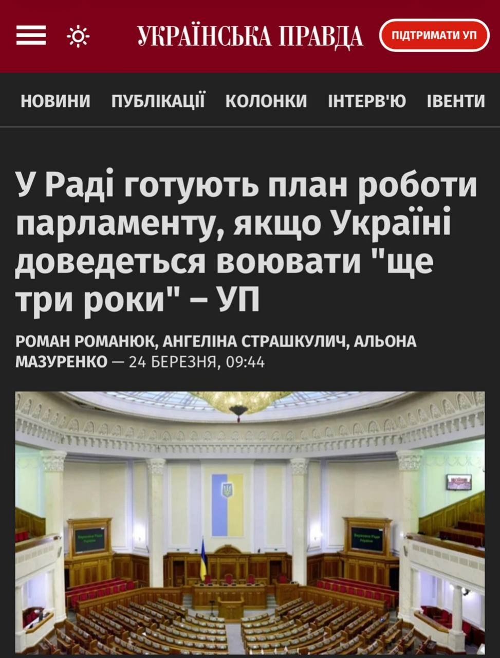 23 марта 2026 года УП опубликовало информацию, согласно которой Зеленский поручил разработать план работы Верховной Рады на случай, если война продлится ещё три года. Что означают эти три года для Украины?