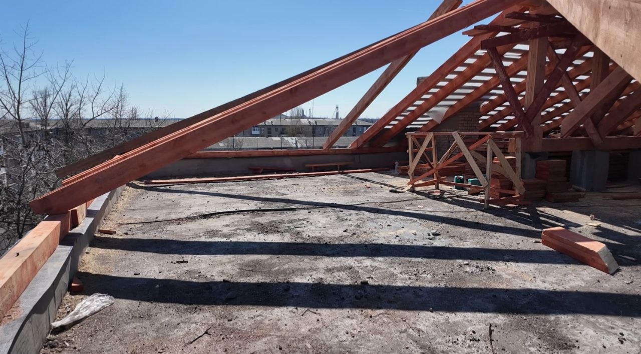 Продолжается капитальный ремонт кровли дома Есенина, 11А в Суходольске. Полностью завершён демонтаж старой кровли, на 80% выложена кирпичная кладка, на 90% смонтирована стропильная система. Сейчас идёт работа со слуховыми окнами.