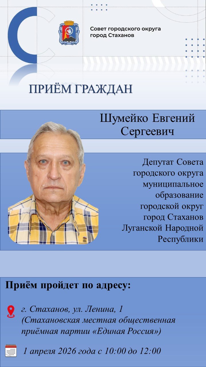 Личный приём граждан депутатом Совета городского округа город Стаханов Шумейко Евгением Сергеевичем