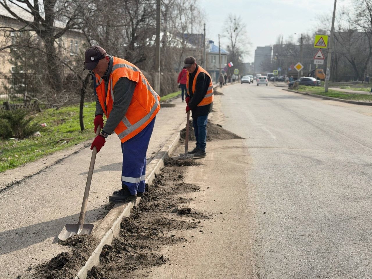 Сегодняшний день не стал исключением: бригада продолжила очищать бордюрный камень от накопившегося за зиму уплотненного грунта.