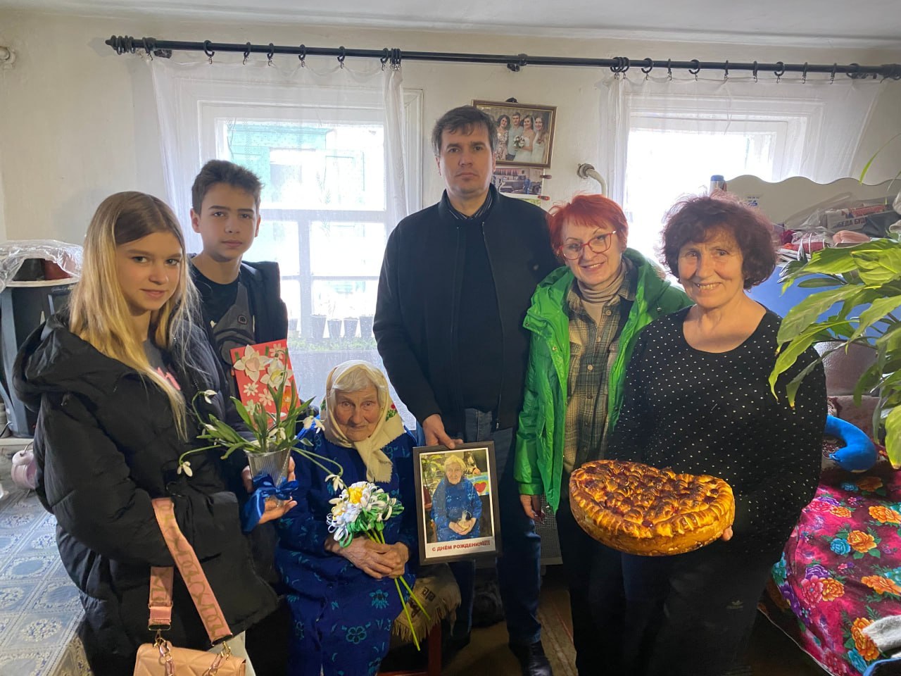 Преподаватели ГБОУ «Кременская СШ№1» и обучающиеся 8 казачьего класса посетили жительницу нашего округа Прасковью Сергеевну, поздравили её с 99-м днём рождения и вручили подарки от воспитанников школы.