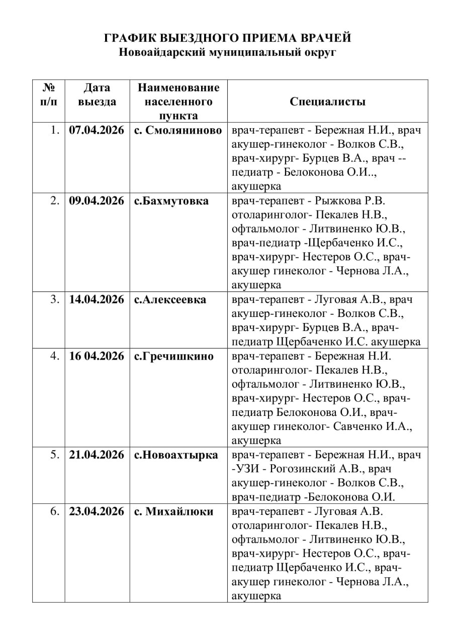 Новоайдарская центральная районная больница информирует жителей Новоайдарского муниципального округа о графике выездов врачей в населённые пункты в апреле 2026 года.