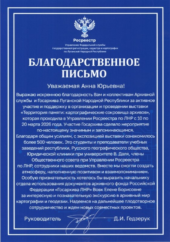Управление Федеральной службы государственной регистрации, кадастра и картографии по ЛНР выражает искреннюю благодарность Архивной службе ЛНР за активное участие в организации выставки «Территория памяти: картографические сокровища архивов», которая проходила с 10 по 20 марта.