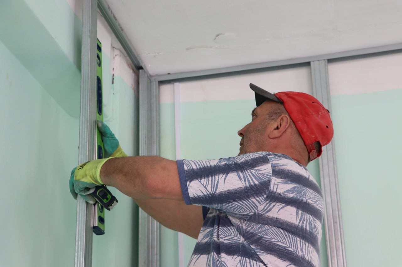 В настоящее время работы только начались и ведутся внутри помещений. На первом этапе подрядной организацией выполняется демонтаж старого напольного покрытия и дверных блоков. После этого специалисты приступили к монтажу металлического каркаса под гипсокартон и замене электропроводки с выводом точек под освещение, розетки и выключатели.