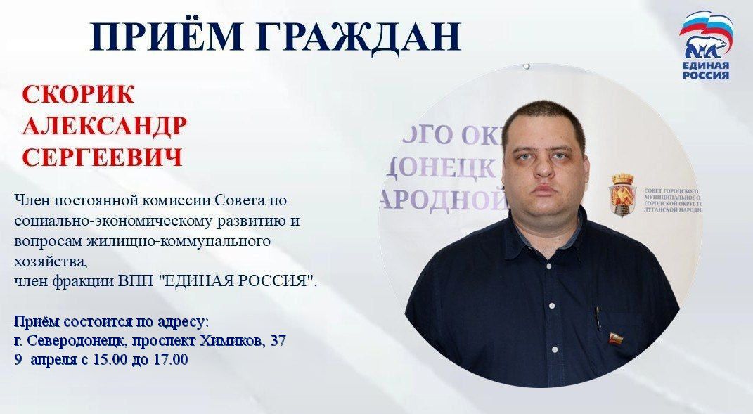 9 апреля с 15.00 до 17.00 прием граждан проведет депутат Совета городского округа город Северодонецк Скорик Александр Сергеевич, член постоянной комиссии Совета по социально-экономическому развитию и вопросам жилищно-коммунального хозяйства, член фракции ВПП "ЕДИНАЯ РОССИЯ".