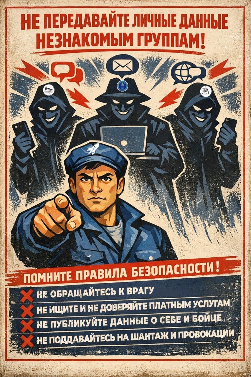 "Пленные и погибшие солдаты", "НЕ ЖДИ меня из Украины", "НЕ ЖДИ хорошие новости", "Наш выход", "Хочу найти", "Хочу вернуть", "Ликвидатор" и т.п. Это проекты СБУ/ГУР! Передавая им данные, вы не только подвергаете опасности бойца, но и совершаете преступление!