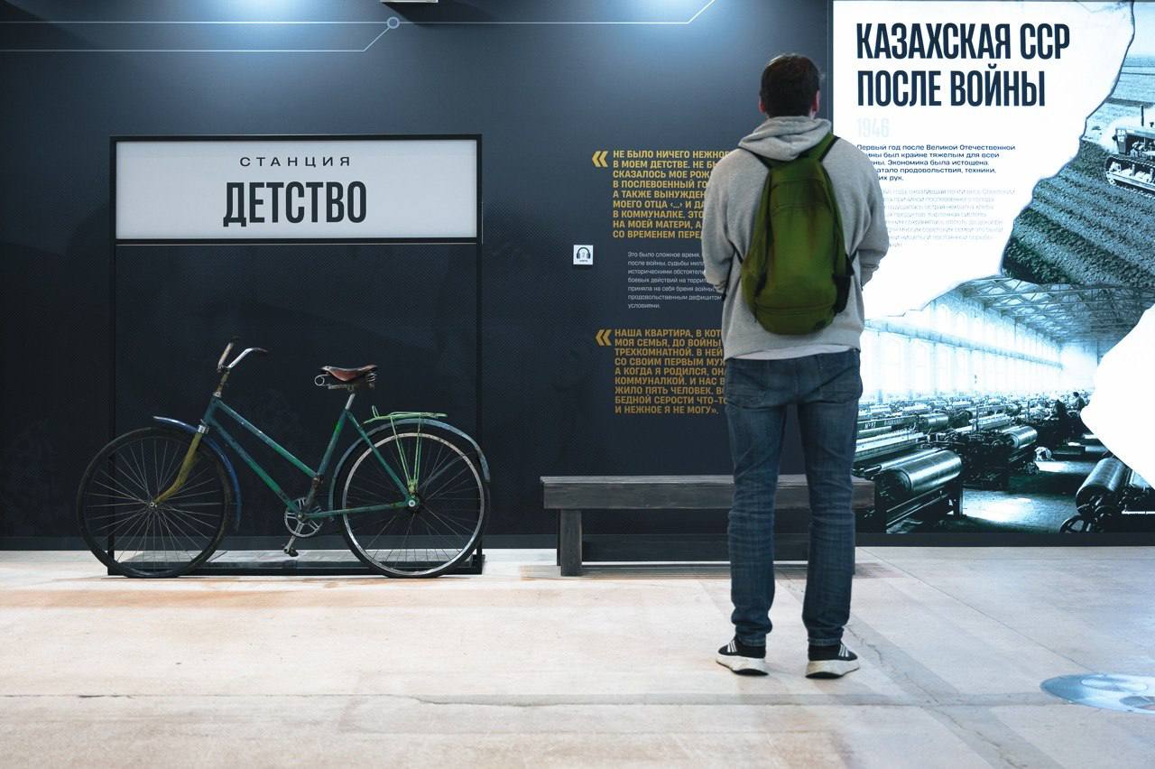 Первая остановка — станция «Детство». Она переносит посетителей в послевоенную Алма-Ату, откуда начался путь будущего политика. Здесь можно увидеть старенький чемодан, с которым юный Владимир Жириновский впервые приехал покорять Москву, и даже подняться на воссозданный фрагмент крыши того самого дома, где он проводил вечера с друзьями.