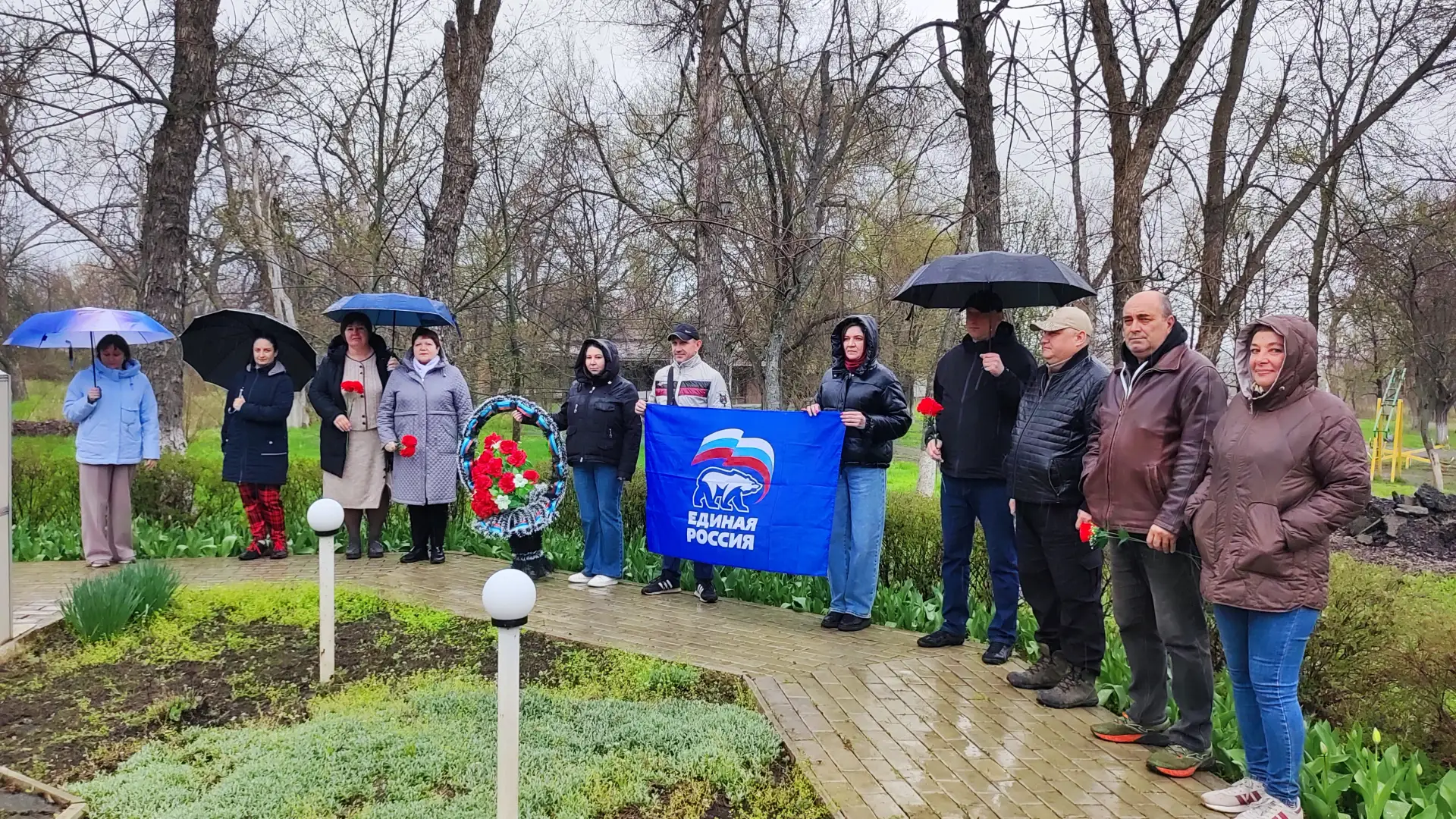 Сегодня в городе Молодогвардейске под эгидой ВПП «Единая Россия» состоялась церемония возложения цветов к Памятному знаку «Погибшим ополченцам и мирным жителям во время боевых действий 2014-2015 годов».