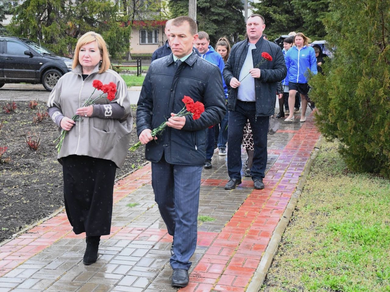 В знак скорби вместе возложили цветы к Закладному камню на месте строительства Мемориального комплекса в память о погибших мирных жителях и защитниках Донбасса.