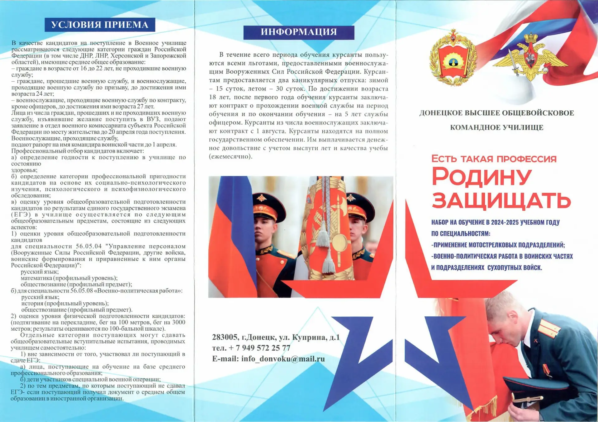 Военный комиссариат Славяносербского района Луганской Народной Республики проводит набор молодых людей в качестве кандидатов на поступления в Донецкое высшее общевойсковое командное училище в 2026 году, имеющих среднее образование: