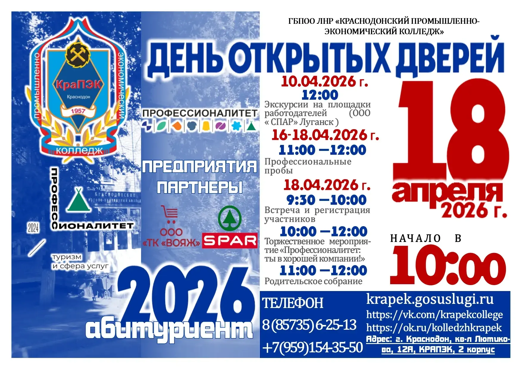 Краснодонский промышленно-экономический колледж приглашает на День открытых дверей в кластере Федерального проекта «Профессионалитет»!