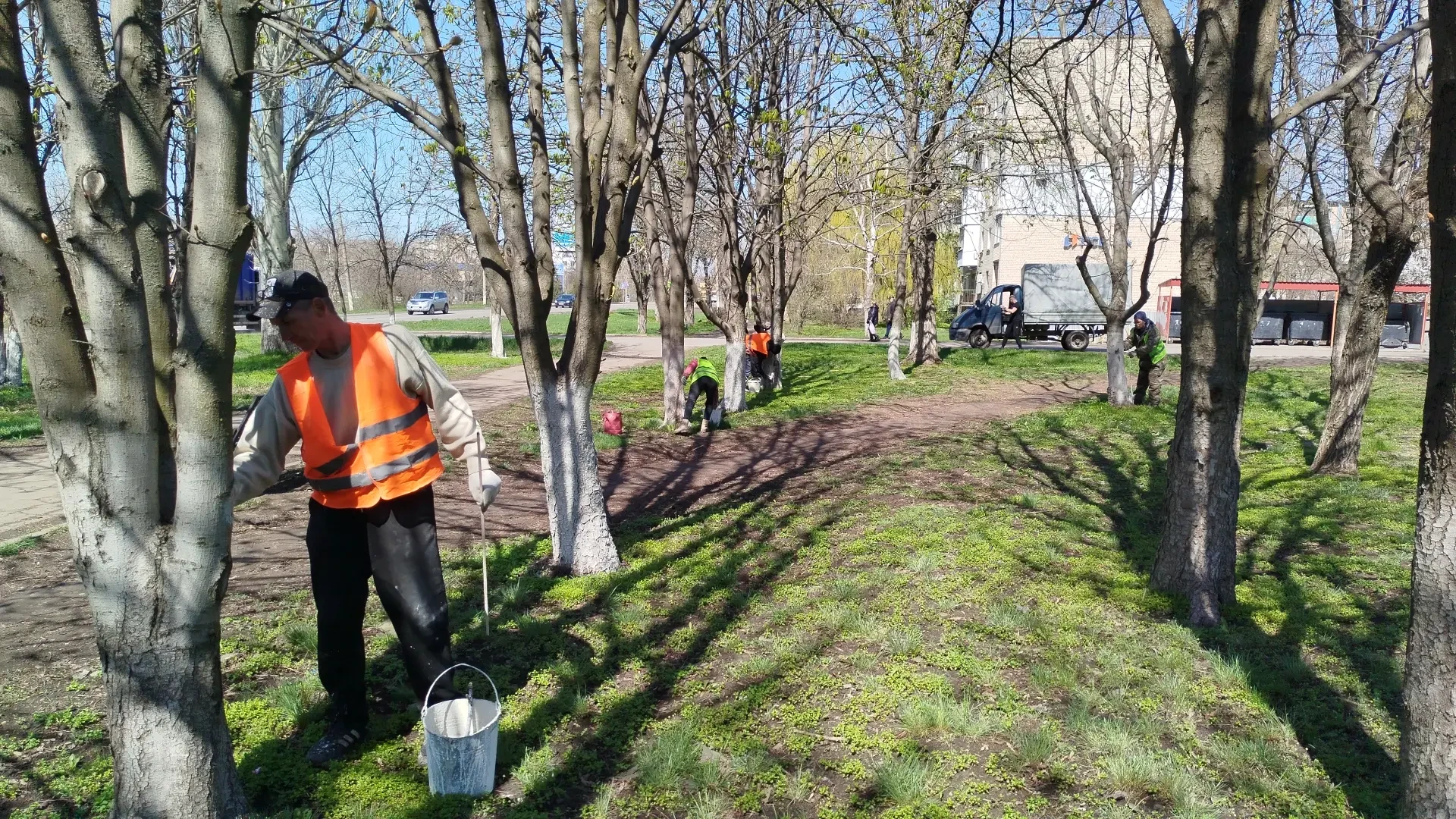 Сегодня сотрудники МУП «ЖЭК» города Ровеньки провели работы по благоустройству территории сквера афганцев, расположенного у памятника "Черный тюльпан": побелили деревья, которые растут на территории сквера.