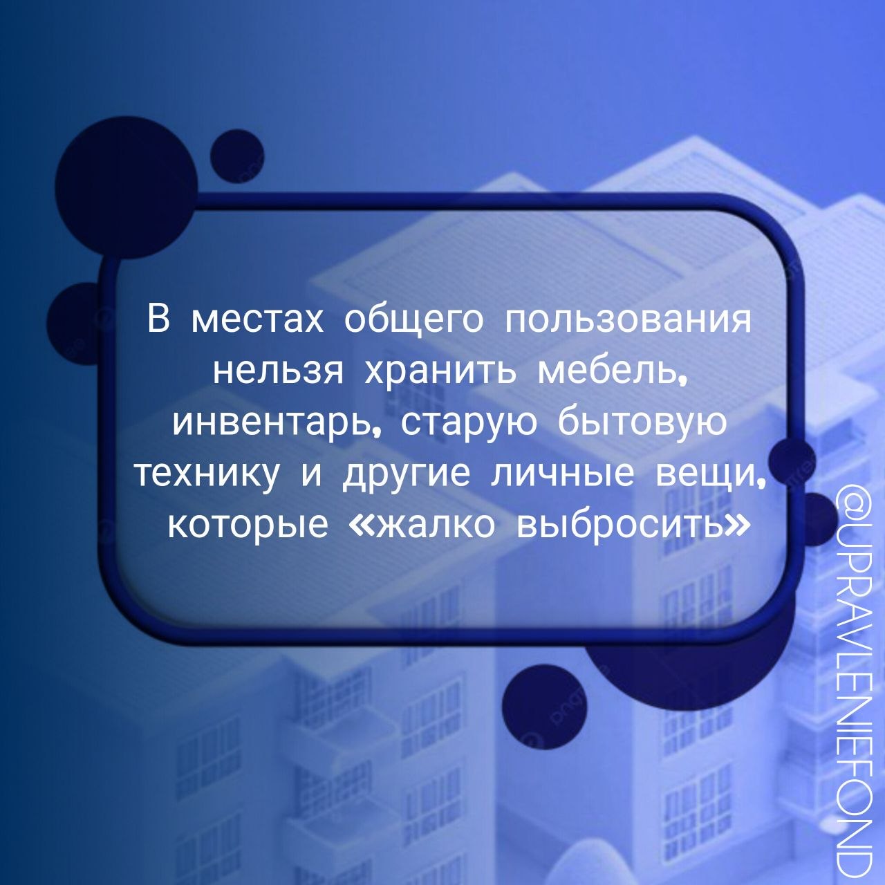 В местах общего пользования нельзя хранить мебель, инвентарь, старую бытовую технику и другие личные вещи, которые «жалко выбросить». Это нарушает сразу несколько законодательных норм, включая правила противопожарного режима, а также представляет опасность для жизни и здоровья окружающих: бытовой хлам может загореться, помешать работе спасателей в момент чрезвычайной ситуации, и т.д.