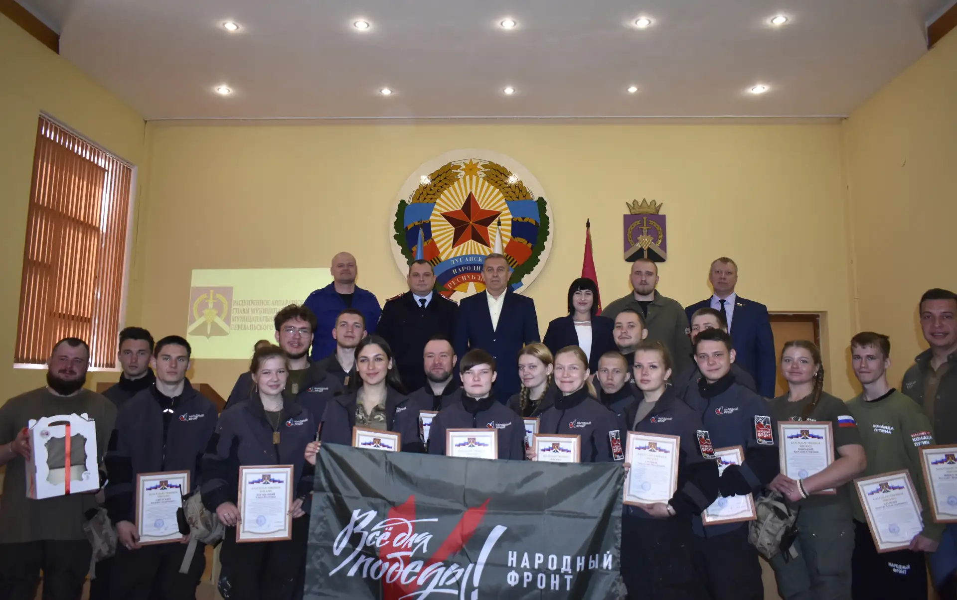 Началось заседание с вручения благодарственных писем Главы округа участникам «Народного фронта», которые помогали в восстановлении поселка Центральный после обстрела ВСУ.