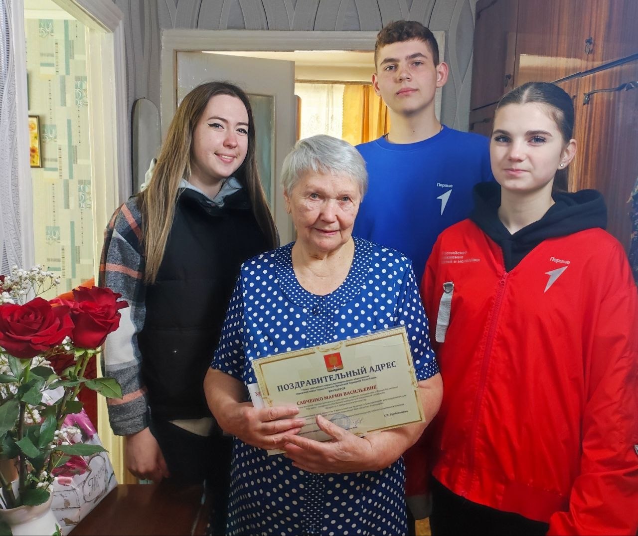 Пришли поздравить именинницу представители Администрации городского округа, отдела молодежной политики, председатель городской организации ветеранов Елена Рогова, активисты Всероссийского общественного движения "Волонтеры Победы" и передали именное поздравление от Президента Российской Федерации Владимира Владимировича Путина и поздравительный адрес от Главы городского округа Светланы Петровны Гребеньковой со словами уважения и признательности за многолетний труд, мудрость, передачу опыта молодежи.