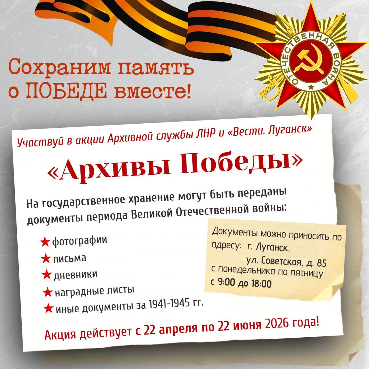 Архивная служба ЛНР совместно с «Вести. Луганск» запускает акцию «Архивы Победы»