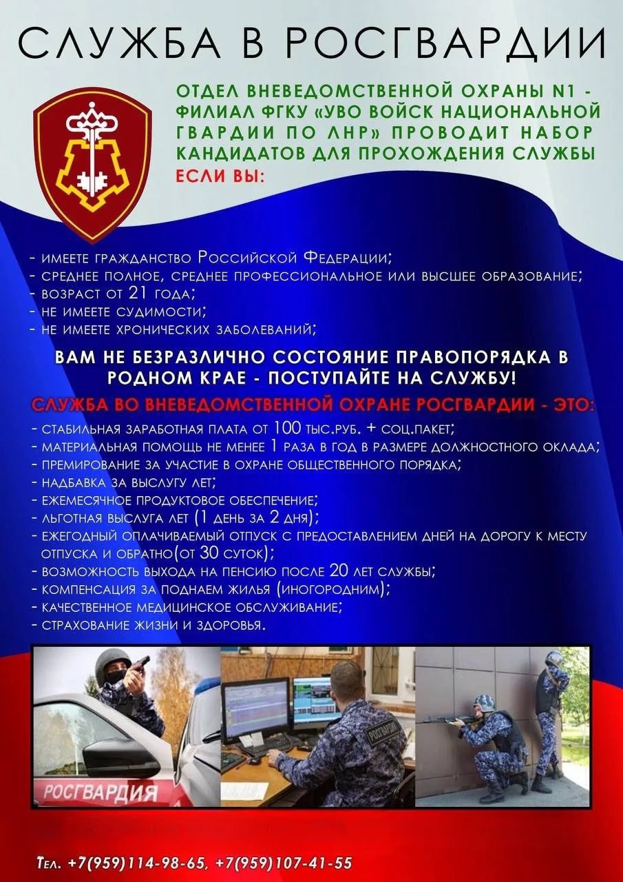 Отдел вневедомственной охраны №1 филиал ФГКУ «УВО войск национальной гвардии по ЛНР» проводит набор граждан на СЛУЖБУ В РОСГВАРДИЮ