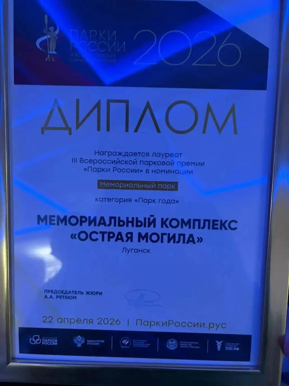 Мемориальный комплекс «Острая Могила» и Сквер Славы в Луганске отмечены на III Всероссийской парковой премии «Парки России»
