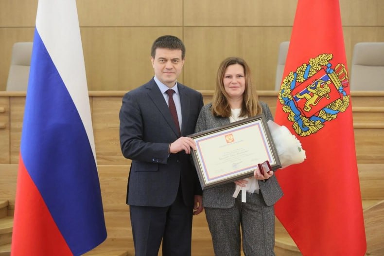 Губернатор Красноярского края Михаил Котюков вручил руководителю проектного направления ООО «Стройтехмонтаж» Елене Викторовне Черниковой Почетную Грамоту Президента Российской Федерации за активное участие в мероприятиях по восстановлению объектов социальной, жилой, транспортной и иной инфраструктуры Свердловского округа ЛНР.