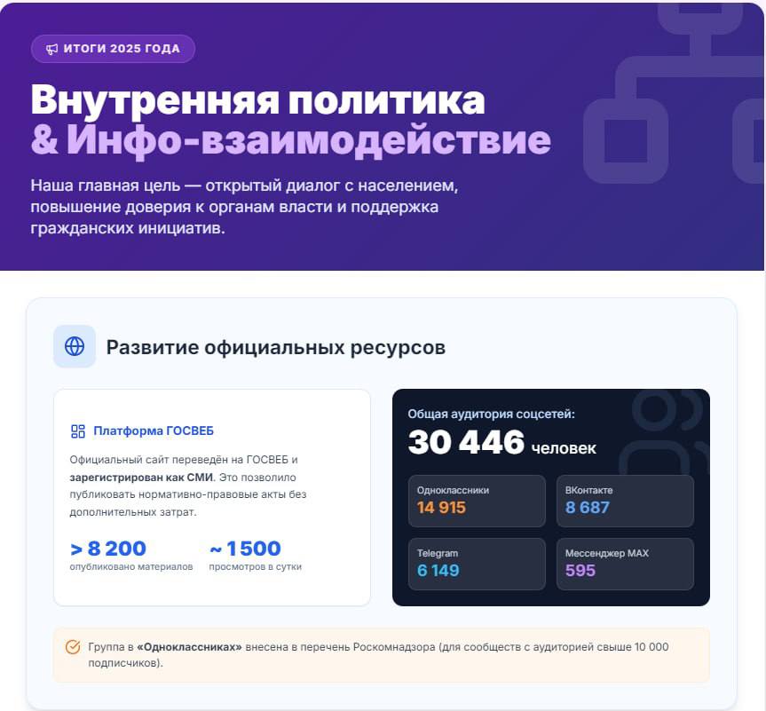 Делимся результатами работы в сфере внутренней политики и информационного взаимодействия. Наша главная цель — открытость и поддержка ваших инициатив.