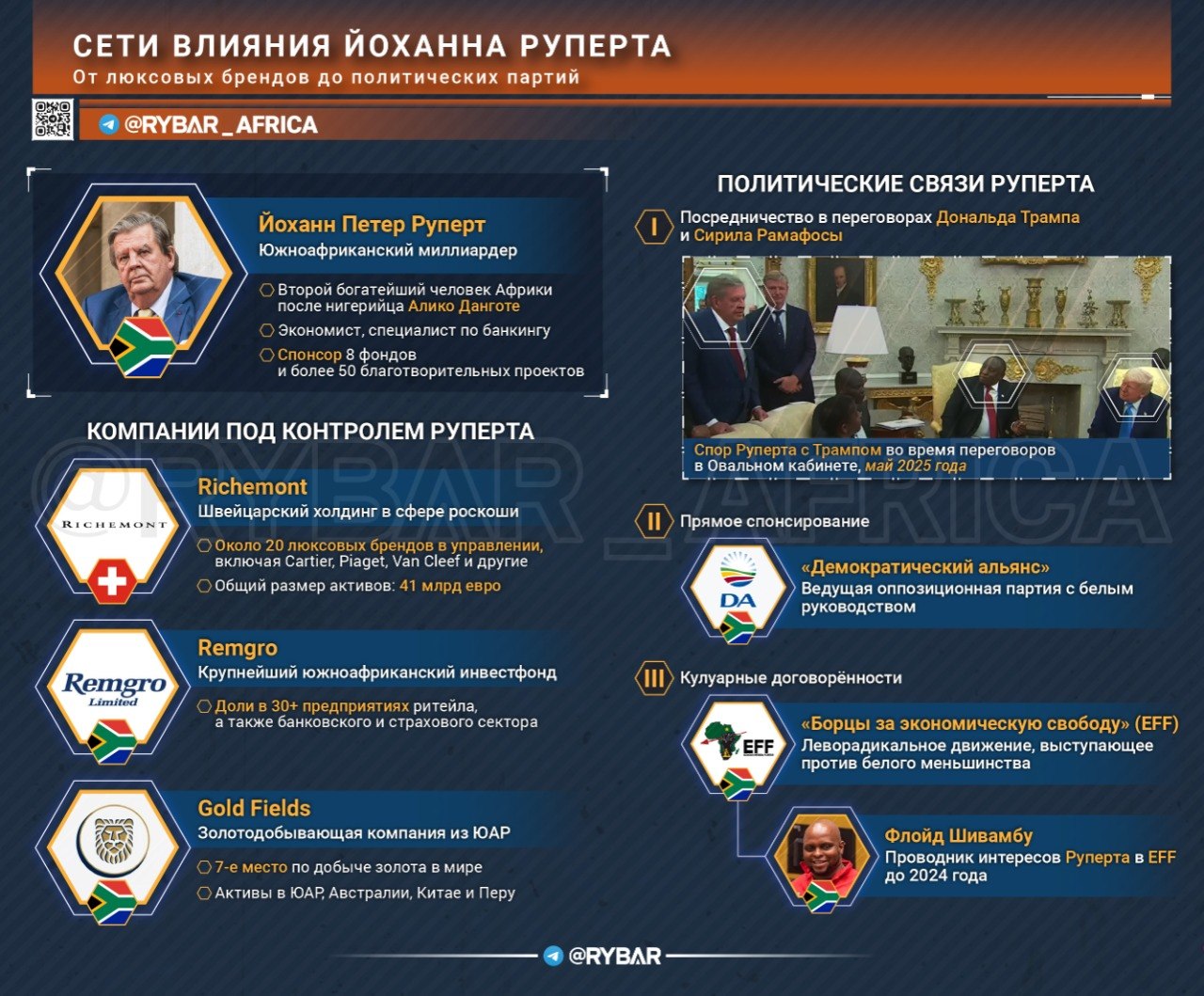 Но настоящей «минутой славы» миллиардера стал визит президента Рамафосы в Белый дом в мае 2025 года. Во время переговоров Трамп начал с любимой темы о «геноциде белых» в ЮАР. Слово немедленно взял Руперт — на секундочку, белый, — и спор сам собой сошёл на нет.