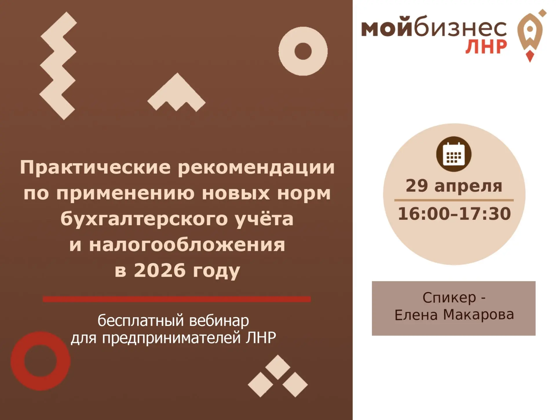 В апреле 2026 года принят новый пакет поправок в налоговое законодательство, часть из которых смягчает условия налогообложения. Какие поправки приняты и как использовать новые возможности для вашего бизнеса – обсудим на вебинаре Центра «Мой бизнес» ЛНР.