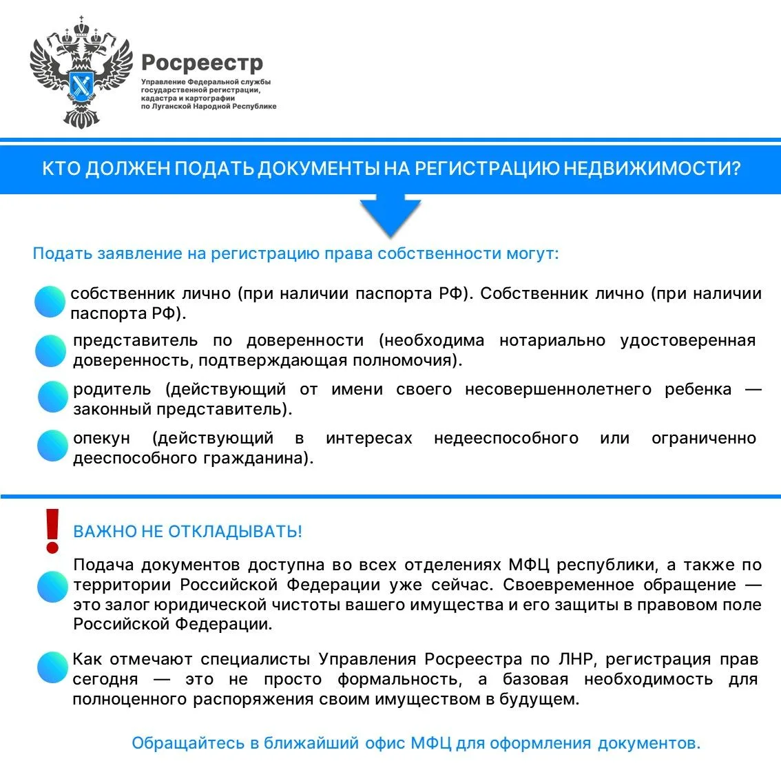 Управление Росреестра по ЛНР напоминает: процесс внесения сведений в Единый государственный реестр недвижимости (ЕГРН) носит заявительный характер. Это значит, что инициатива должна исходить от правообладателя.